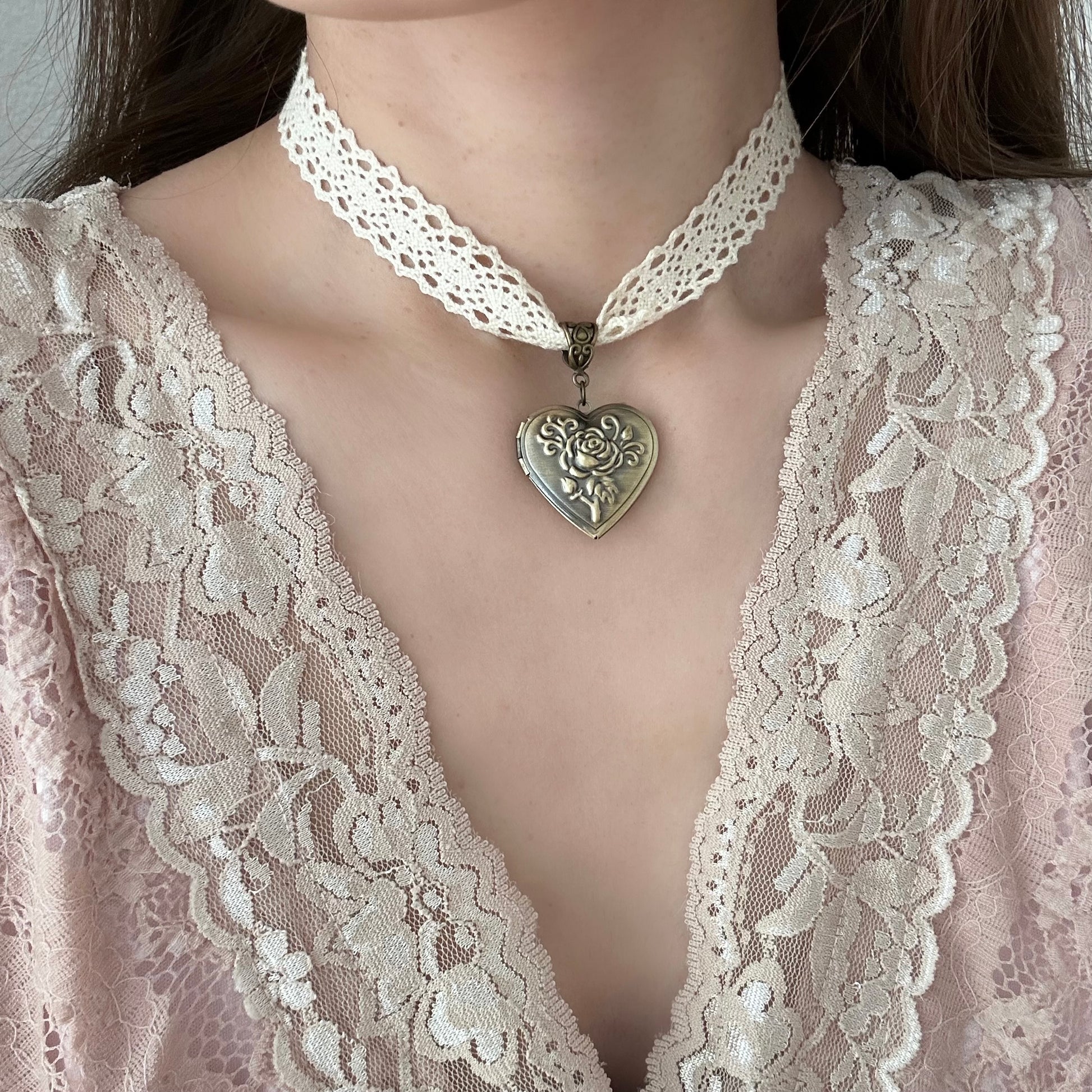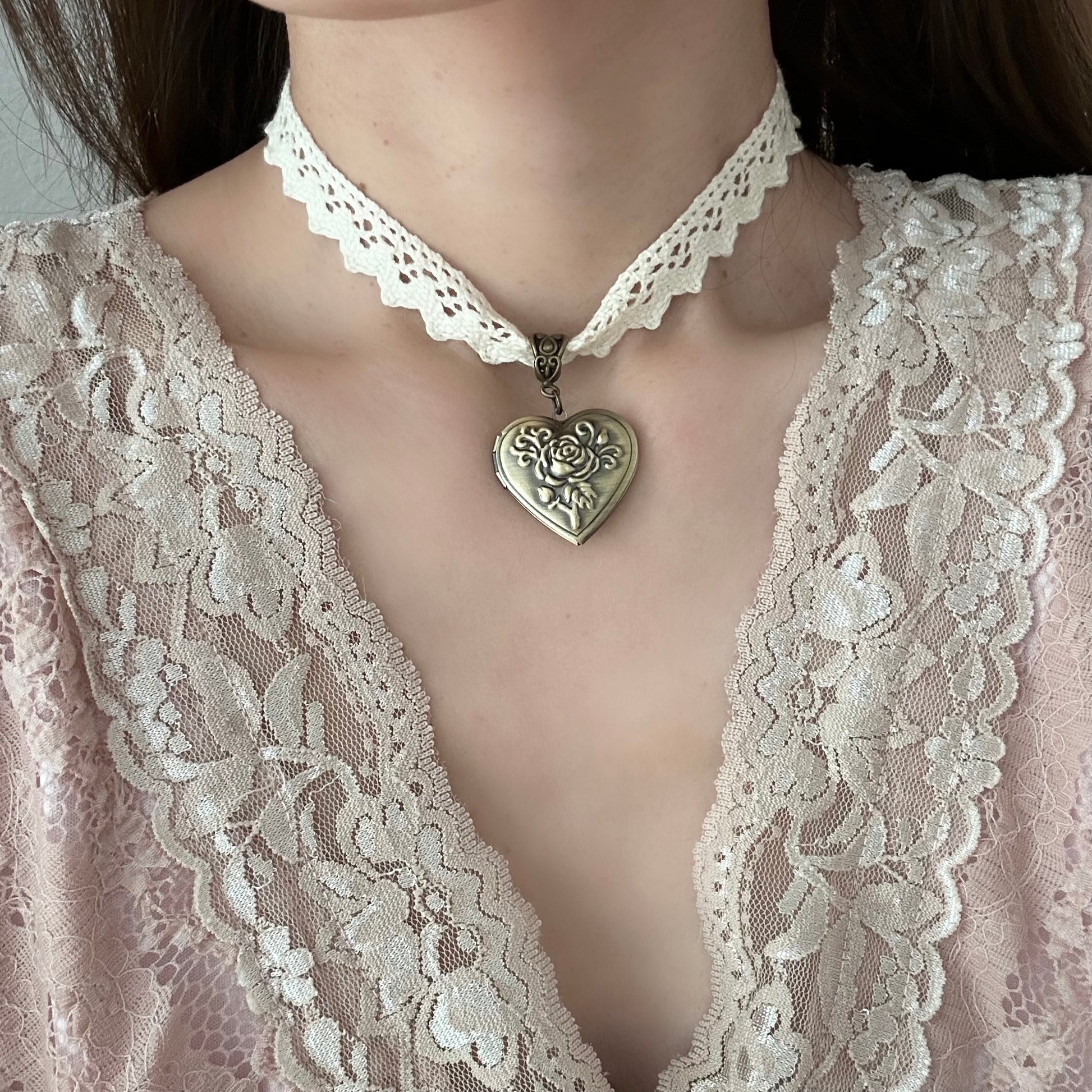 Material: Vintage brass heart rose locket pendant with cotton lace ribbon.